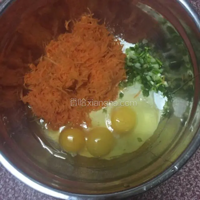 3.把面粉,胡萝卜丝,葱放入大盆中