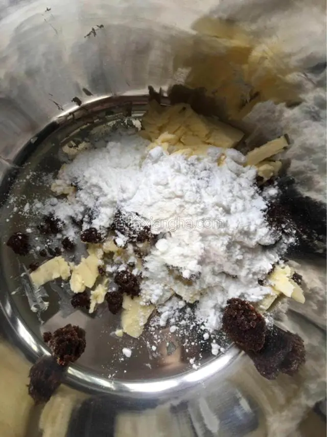 2.用一个无油无水的大盆。放入自然软化的切片黄油,用刮刀切拌均匀,再加入糖粉和红糖。(不喜欢太甜的可以不放糖粉或者红糖,红糖是为了颜色好看)