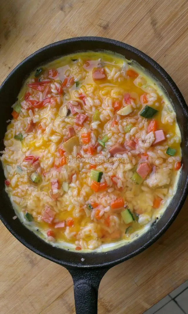 6.鸡蛋打散,均匀的倒到米饭上
