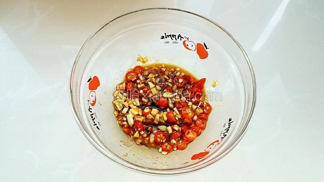 4.在小米椒和蒜末中放入生抽、醋和白糖拌匀,如果口重的话也可以加少许盐。