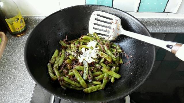 6.看锅中汤汁变少,豆角段生加入蒜末炒匀即可出锅