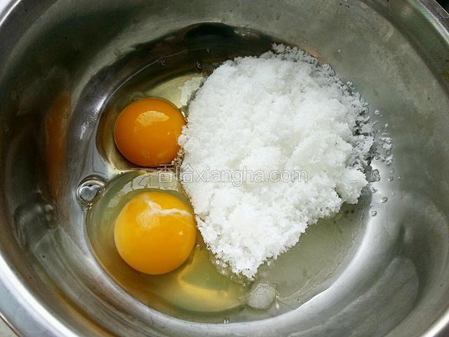 2.鸡蛋打入盘中,放入糖
