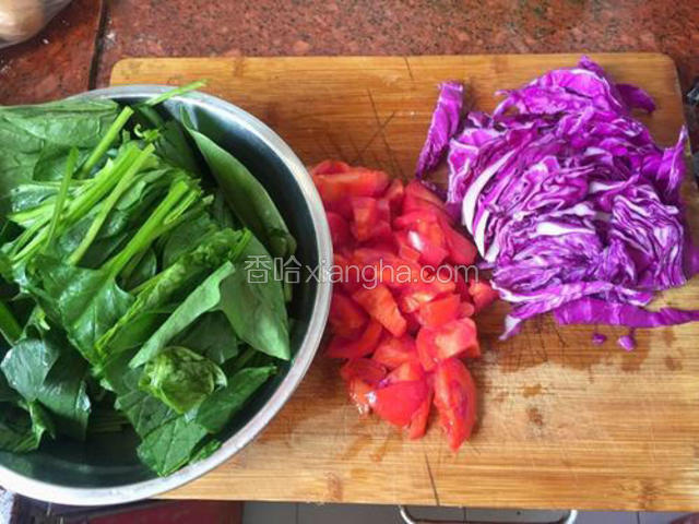 2.菠菜切段,西红柿切丁,紫甘蓝切丝备用