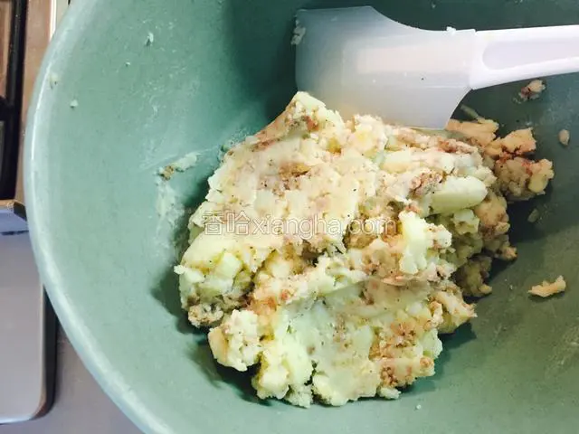 5.炒熟后倒入土豆泥的容器中搅拌,这时候可以再加些盐和黑椒调味