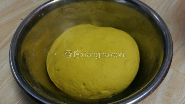 5.南瓜凉到40度左右,放入备好的面粉和酵母揉搓成软硬相当的面团,根据情况加煮的南瓜水或面粉。