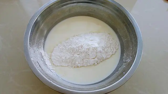 4.把牛奶倒入容器中,筛入低筋面粉、淀粉和糖粉。