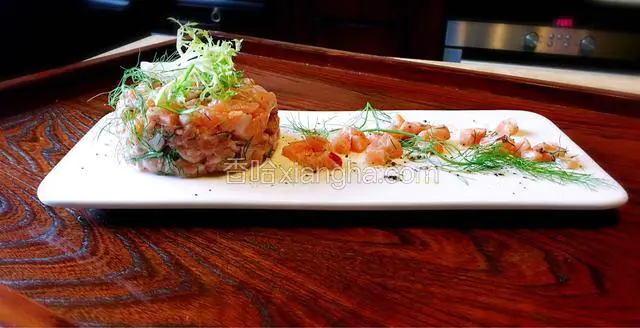 2.三文鱼片去皮,顺着鱼肉的纹理先切条再切丁,樱桃胡萝卜切丁,茴香剁碎(有去腥提香的作用)。