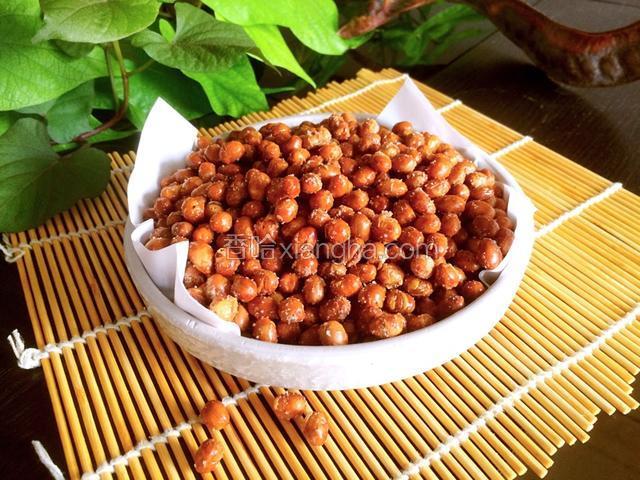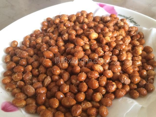 6.直至黄豆粒变得和最初泡水之前大小,且在金黄的基础上慢慢呈现红色,这是翻动黄豆时会发出刷刷的声音,就说明黄豆已经炸好了;