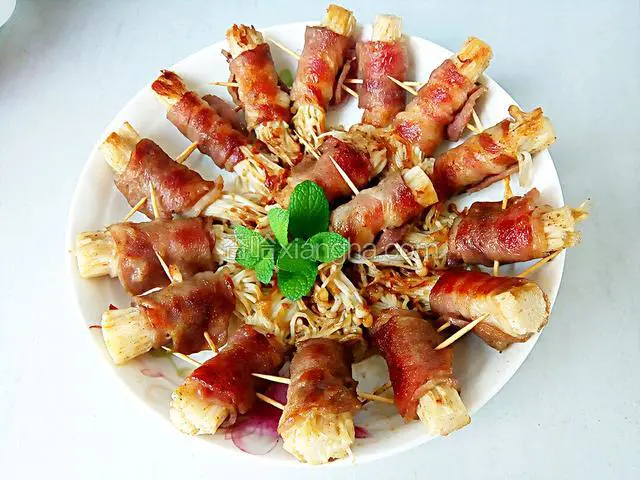 6.翻面烤,培根有盐分,少撒一点点盐,根据个人口味,另撒点五香粉,孜然粉