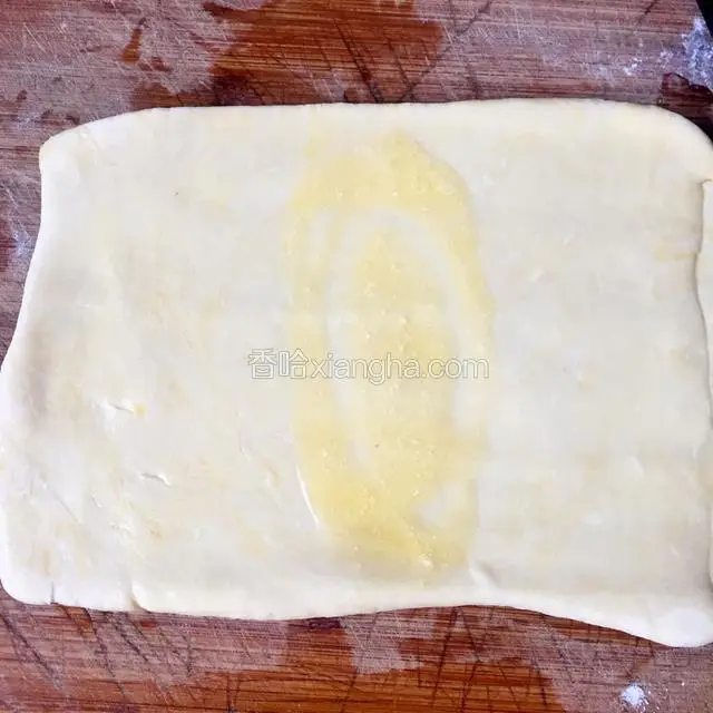 6.来做派皮,先拿一半的面团擀开在中间摸上黄油
