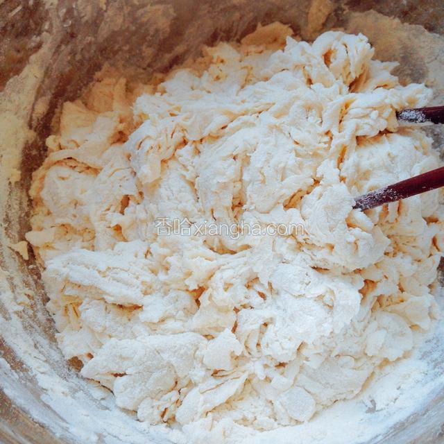 3.把酵母水倒入面粉里,在适量添加温水,用筷子搅拌成絮状