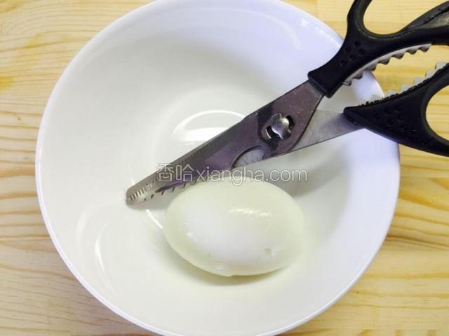 1.我今天就用一个鸡蛋来示范一下,大家请根据自己的需要添加。把鸡蛋煮熟剥皮后放在碗内,请准备厨房剪刀,直接在碗里把鸡蛋煎成碎末、这样可以节省很多时间,也更卫生