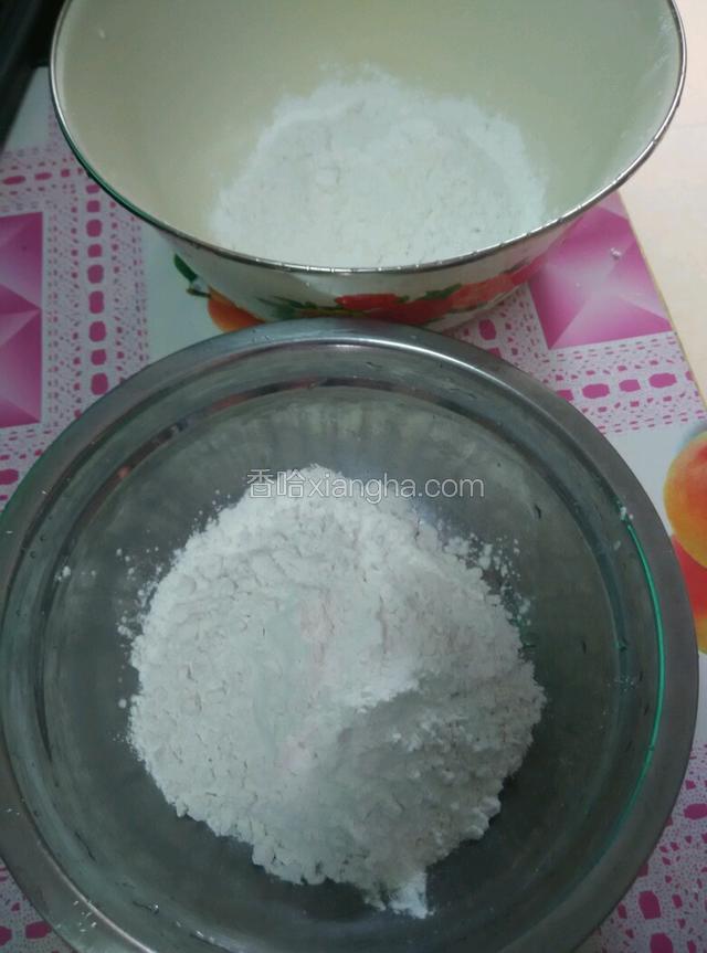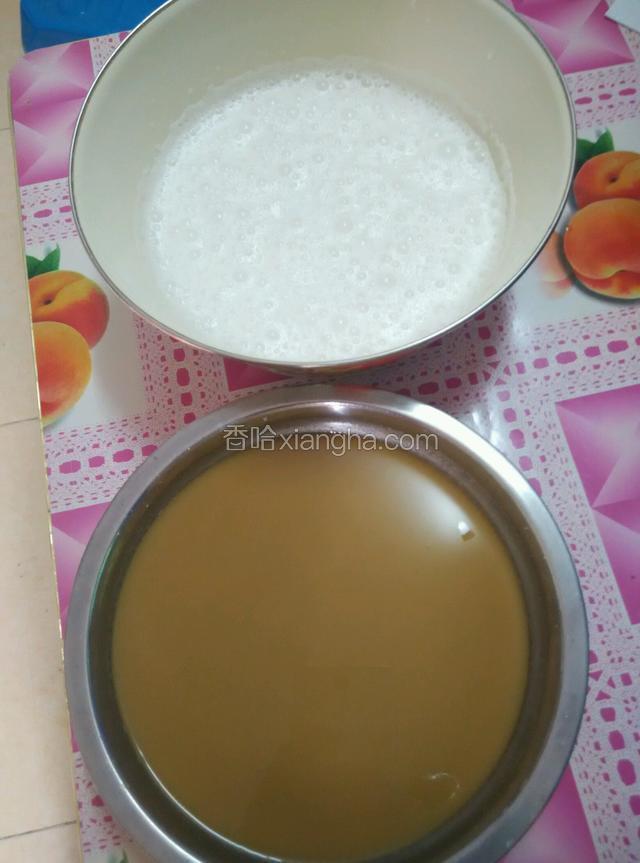 5.两份拌好的一白一红粉浆,白色的粉浆搅拌会起泡泡的哦,所以需要过滤一下更好