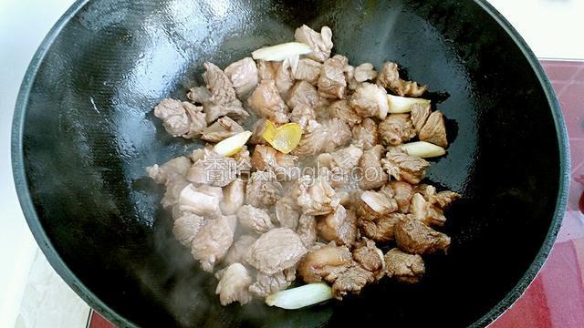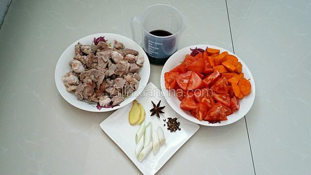 1.准备食材:牛肉切块后焯去血水,西红柿和胡萝卜切块,葱切段,姜切片。