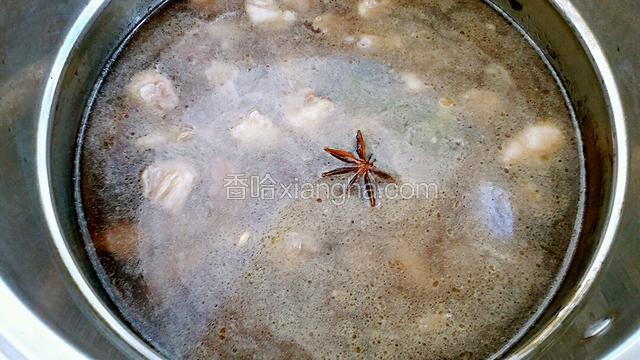 6.再添入100毫升红酒,加入清水没过食材,放进八角大火煮开后改小火炖煮一个小时。