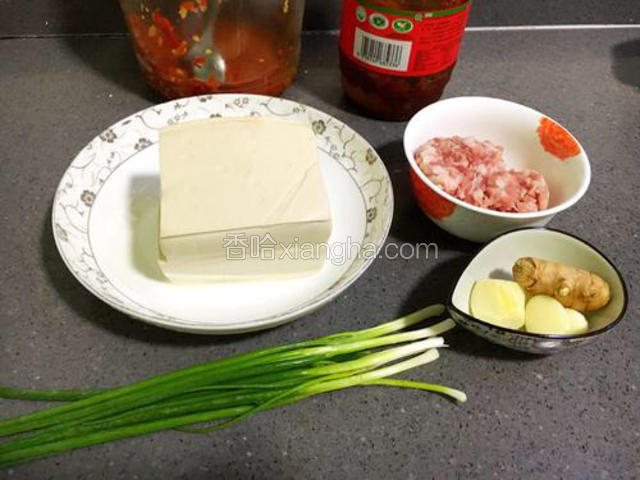 1.准备食材。豆腐一块、猪肉馅适量、香葱适量、蒜、姜适量。