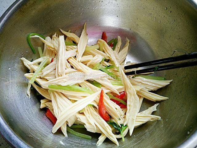 4.捞出过凉水,控干、放入容器内,加入香油、盐、白糖、味极鲜拌均匀。