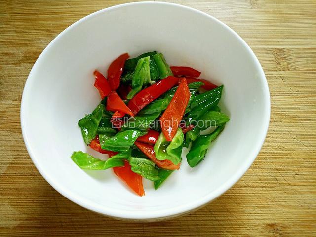 3.锅里放适量油,放入青椒、红辣椒炒七八分熟。