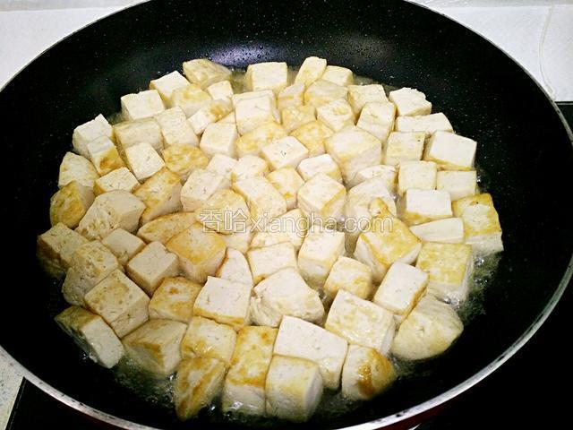 5.锅里留油,倒入豆腐两面煎黄,倒入半汤碗水烧沸腾。