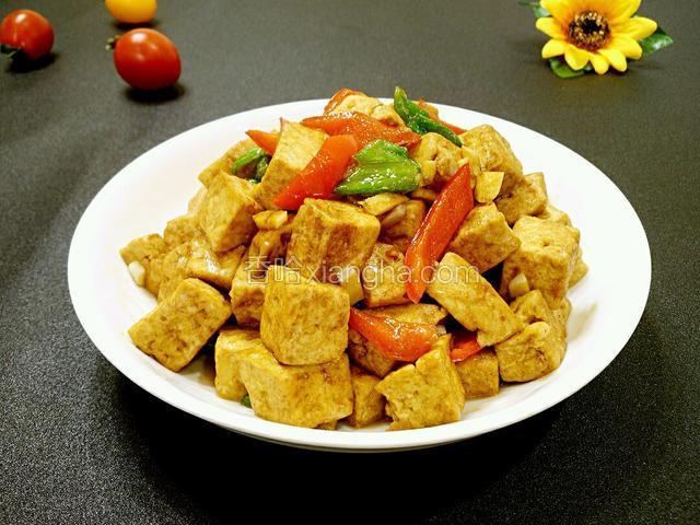 2.青椒、红辣椒切小块、豆腐切小块、蒜切粒。