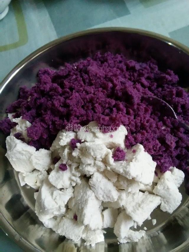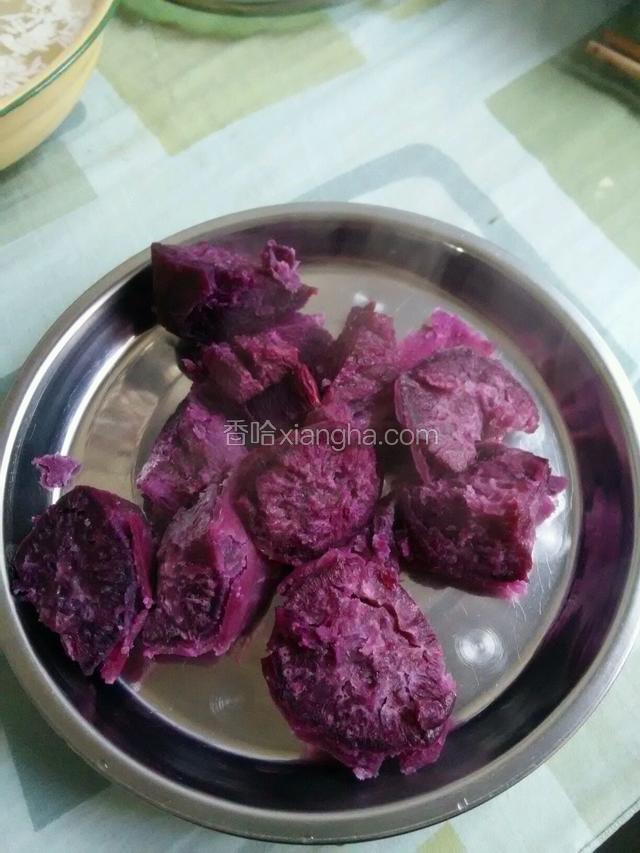 4.紫薯去皮切小块,放入蒸锅蒸15分钟
