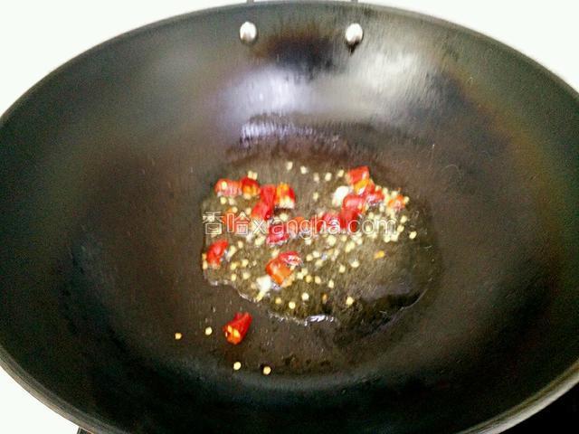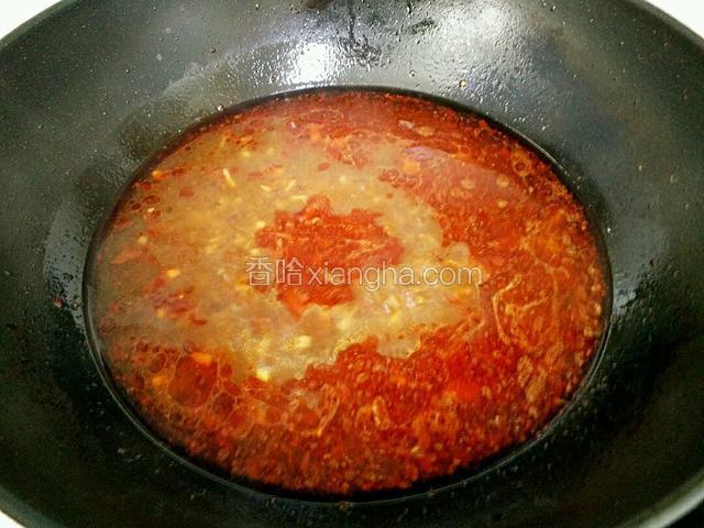 6.锅里放适量油,加入豆瓣酱小火炒出红油后,加入辣椒粉、姜和蒜粒炒出香味。