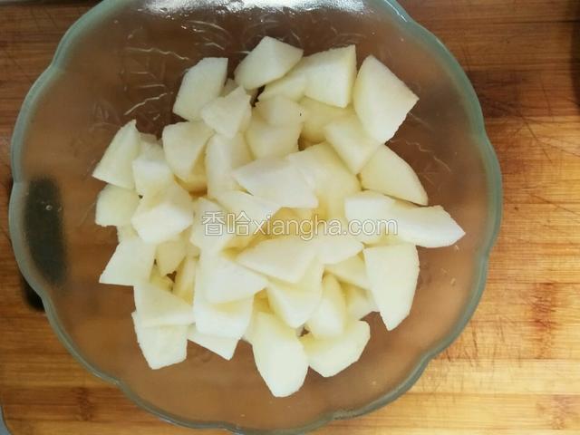 6.锅里倒入适量的清水,放入冰糖,梨块。