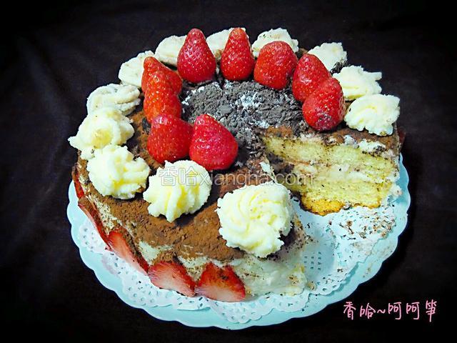 20.裱花蛋糕的材料:八寸戚风一个,草莓,奶油,白糖,吉利丁粉,草莓果酱,薄荷,朗姆酒,可可粉,糖霜,巧克力碎。