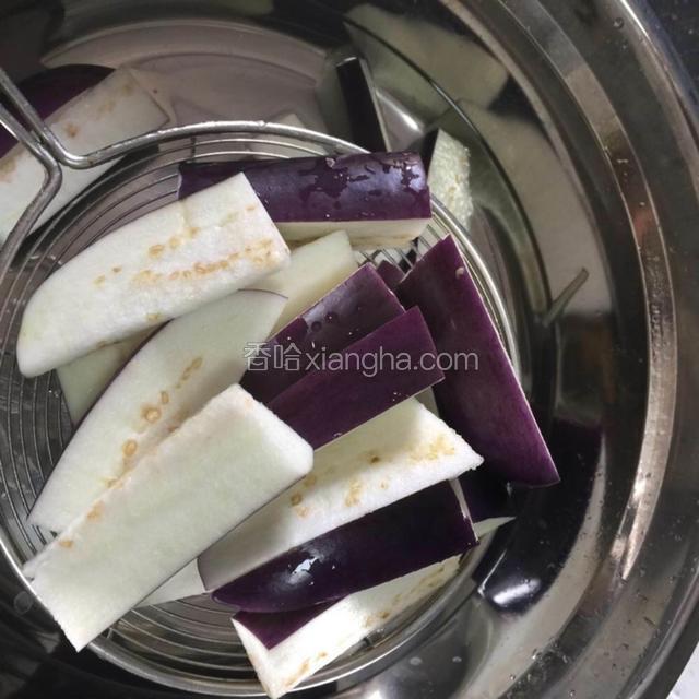 1.茄子切条,用冷水浸泡5分钟(一定要泡哦,茄子才能晶莹剔透又好吃)
