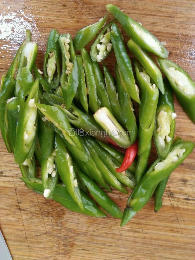 6.留底油,放入辣椒翻炒,放盐炒一下…