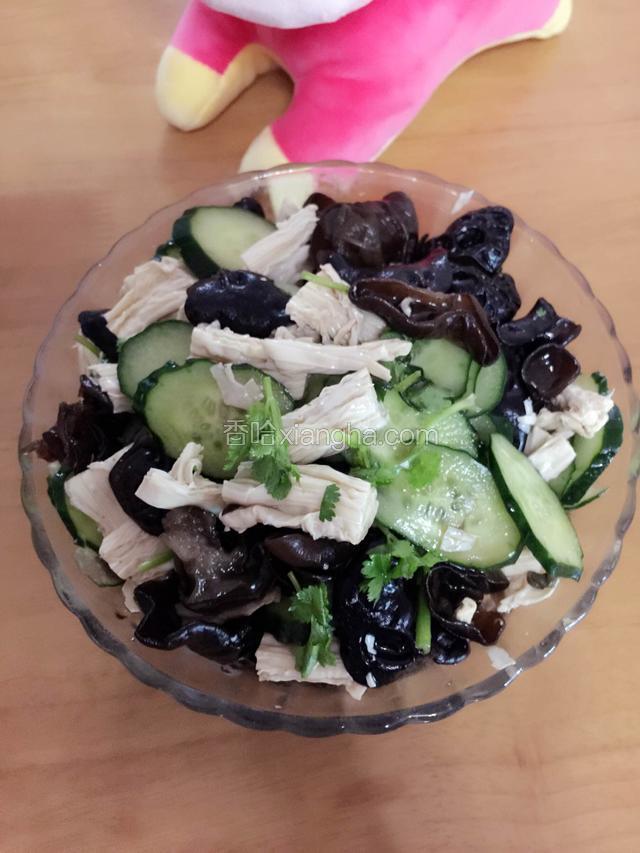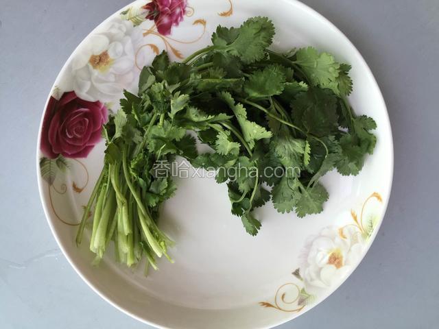 5.将香菜和泡发的腐竹切段,大约1.5厘米左右。