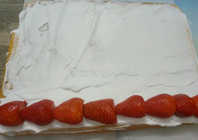 17.用抹刀 在蛋糕上均匀的涂上奶油 注意靠一边的奶油 要抹厚点 方便固定草莓