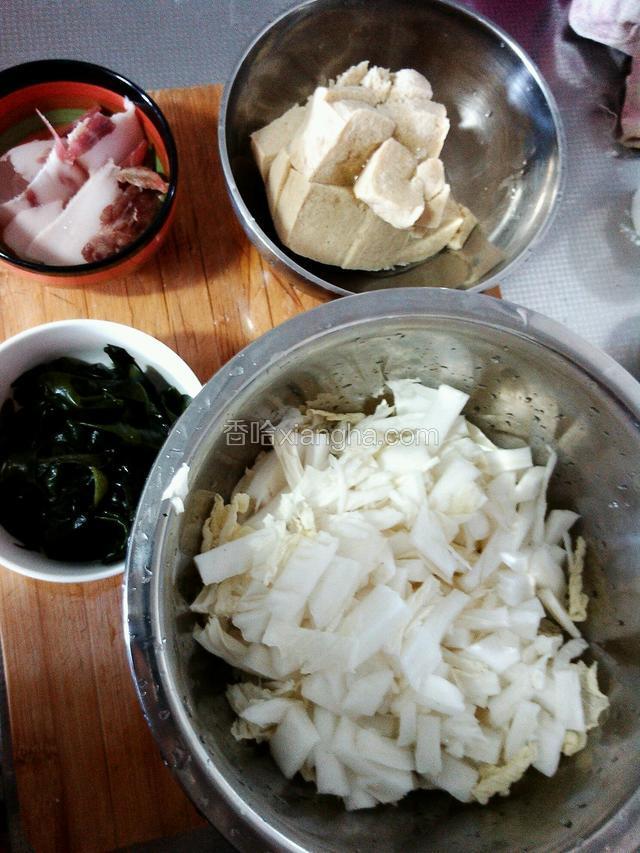 1.准备主要材料,白菜切条,冻豆腐块,群带菜切段,猪肉切片