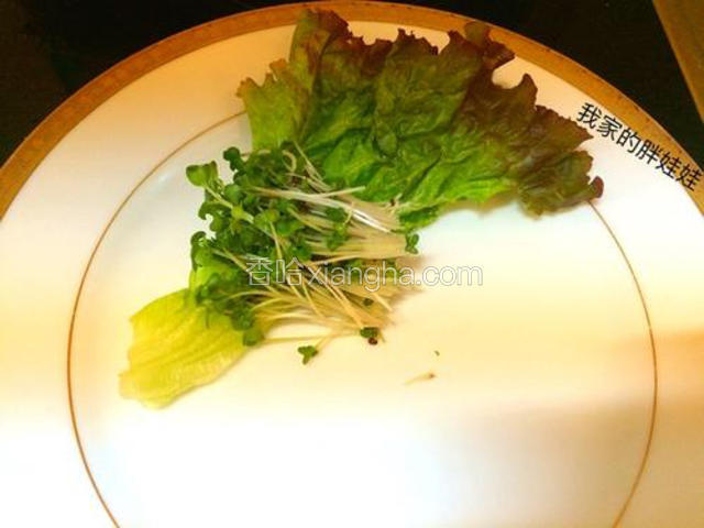 3.现在盘子里放上生菜叶(大小随意),西兰花苗