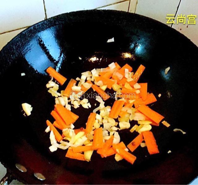 4.把准备好的调料,葱段、姜、蒜粒切末,胡萝卜、香菜切小段备用。