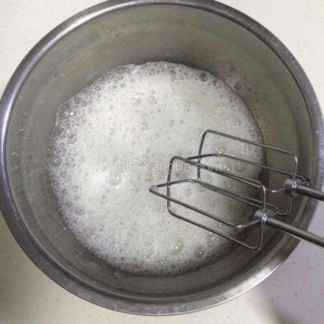 10.用电动打蛋器低速将蛋白搅打至呈鱼眼泡状时,加入1/3细砂糖;