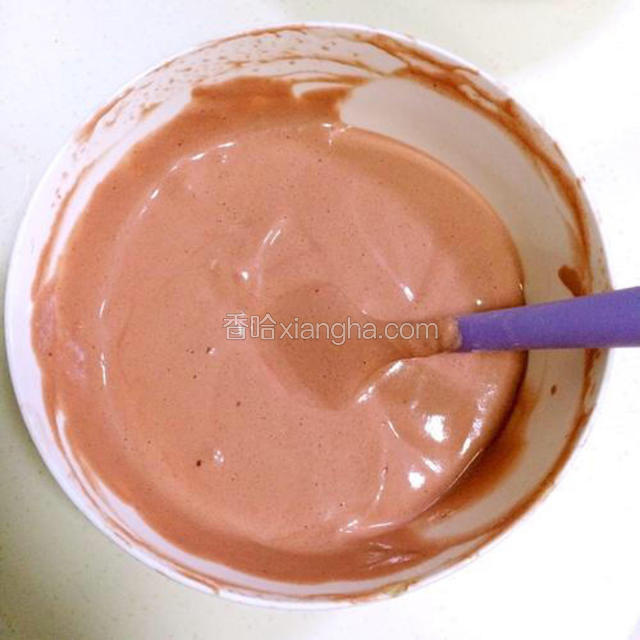 8.用刮刀翻拌均匀,如果有起块的面粉团,可以用刮刀按压下,红曲蛋黄糊完成后放一旁备用;