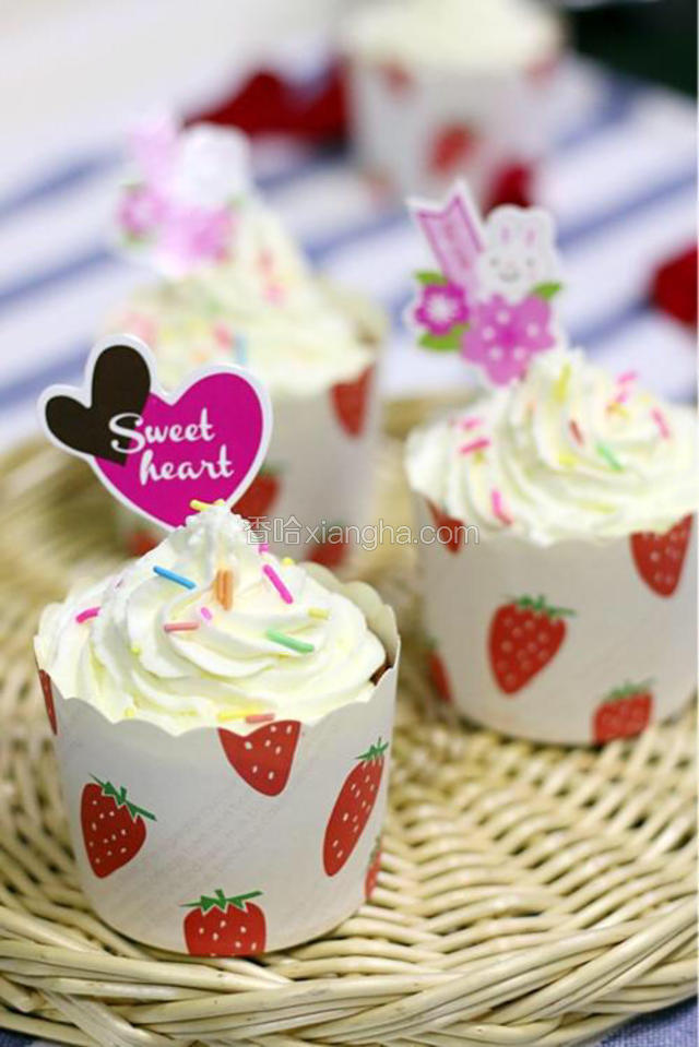 26.在纸杯蛋糕上挤出花纹,撒上些彩色糖珠粉;