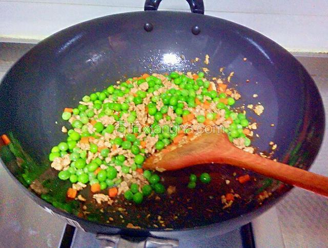 6.最后倒入豌豆放入适量盐迅速翻炒均匀淋入少许香油就可以出锅装盘了。