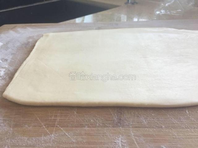 6.把松弛好的面团和裹入用的黄油片一起拿出来,在案板上撒一层薄粉防粘,把面团放案板上擀成比黄油片稍大的面片,能裹住黄油即可。