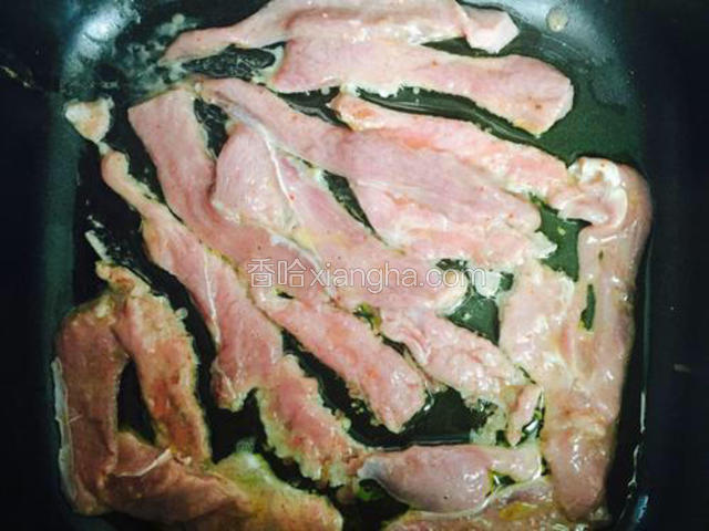 6.抓匀之后热锅凉油,把羊肉均匀的铺在锅底,大火油煎