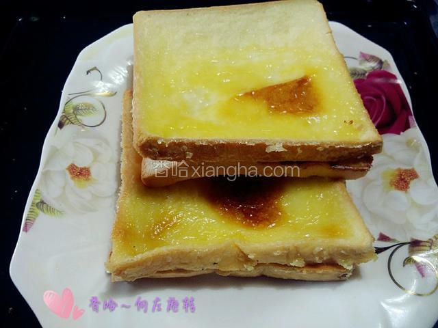 在吐司片上浇奶酪液时,四个边角不要浇,这样,烤出来的吐司片四周才会香脆可口。