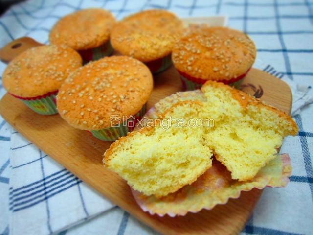 5.准备好六连模,放入纸托,没有就在模具里刷一层色拉油防粘,倒入面糊,撒上白芝麻