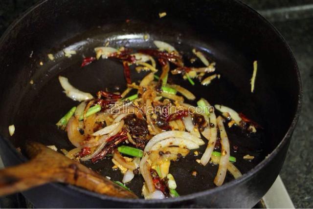 5.锅中加入葱白、姜丝、蒜末、干红辣椒丁、洋葱翻炒出香味。