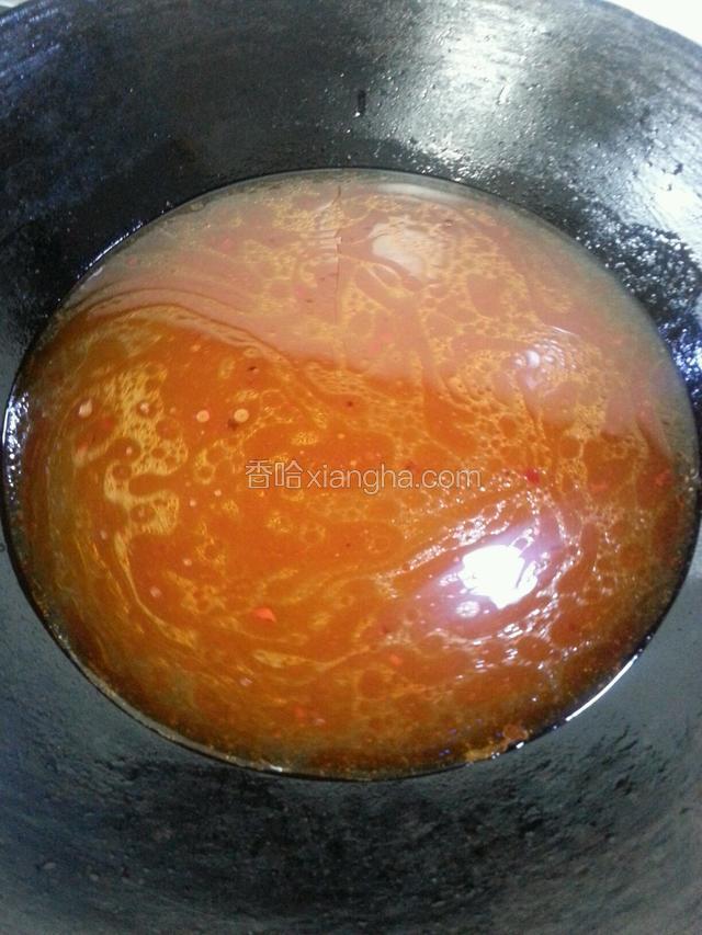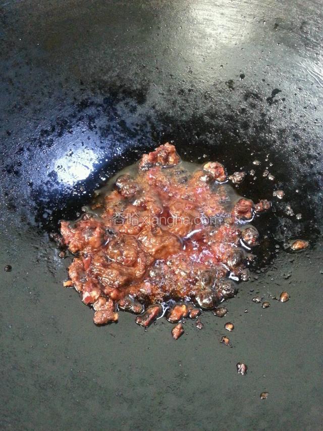 2.油烧热加入郫县豆瓣酱一勺,六月香豆瓣酱一勺,老干妈风味豆豉一勺,炒红油