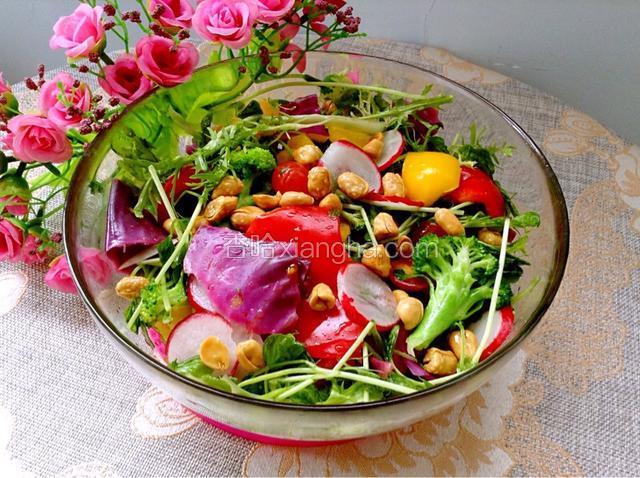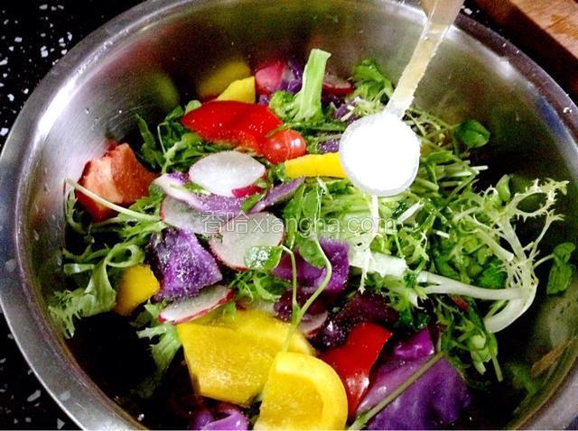2.洗净后浸泡30分钟,(水中放少许盐,去处部分农药残留)彩椒和紫甘蓝掰成小块。