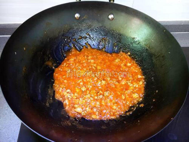 6.番茄酱加入小半碗水搅匀,倒入锅中一起煮