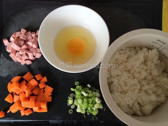 1.准备所有食材,香肠,胡萝卜切丁