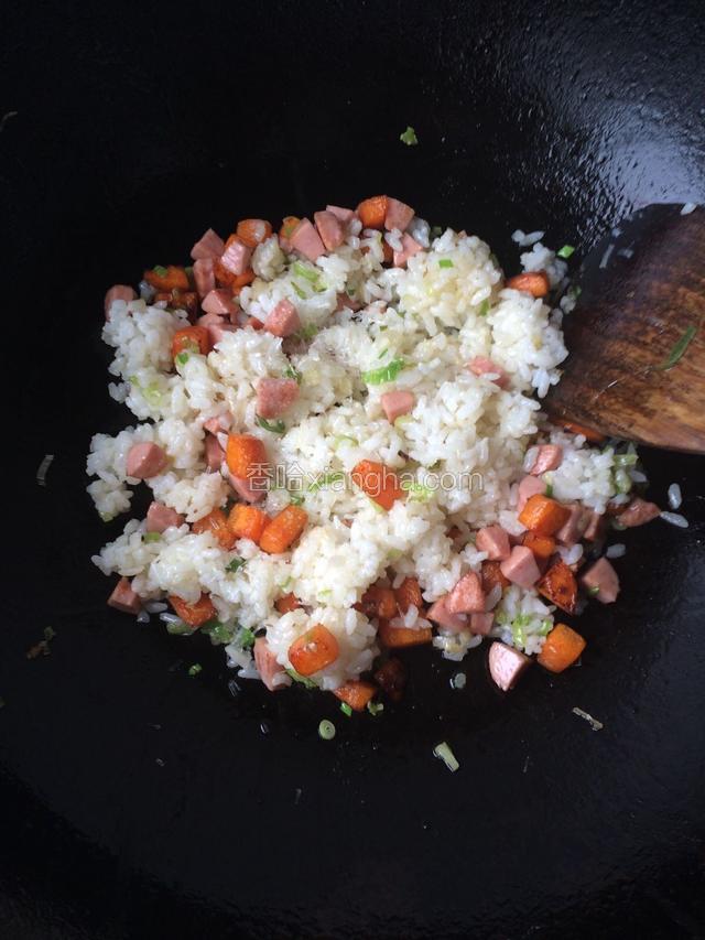 6.胡萝卜丁好后放入香肠丁翻炒