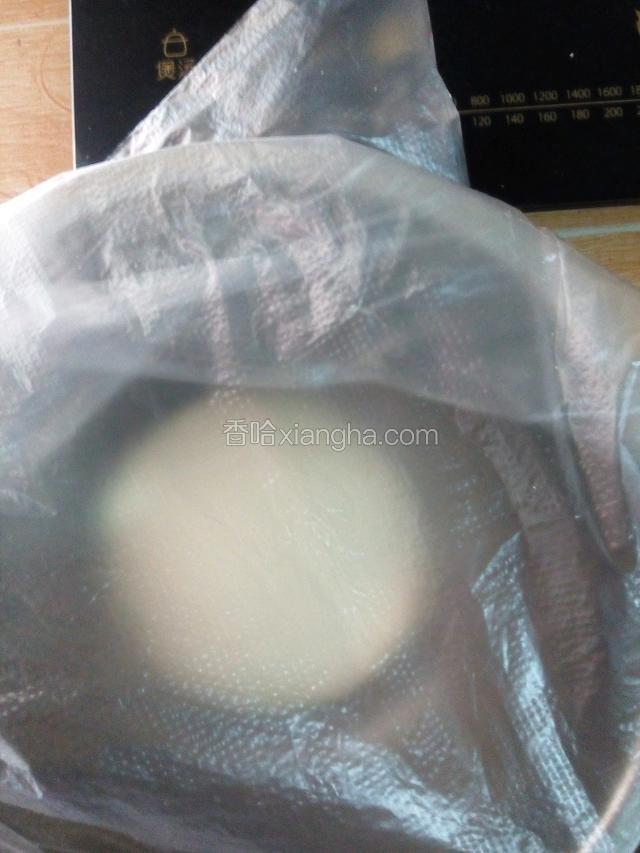 3.面团装盆盖保鲜膜发酵1小时(现天热发酵的快)